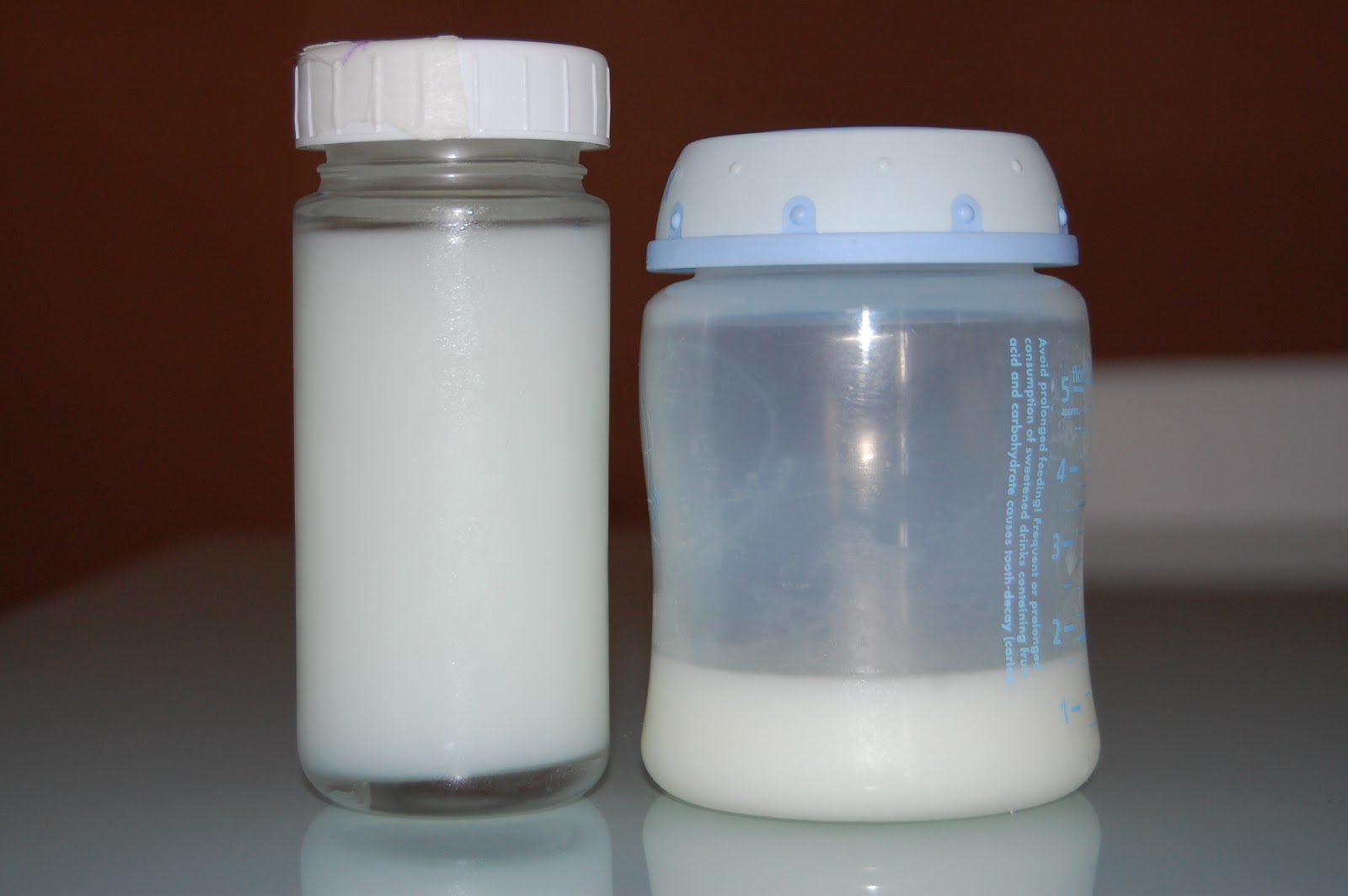 O frasco da esquerda, que é o leite anterior, está com o leite mais acinzentado e fluido e o da direita, que é o posterior, está bem mais branco e denso.